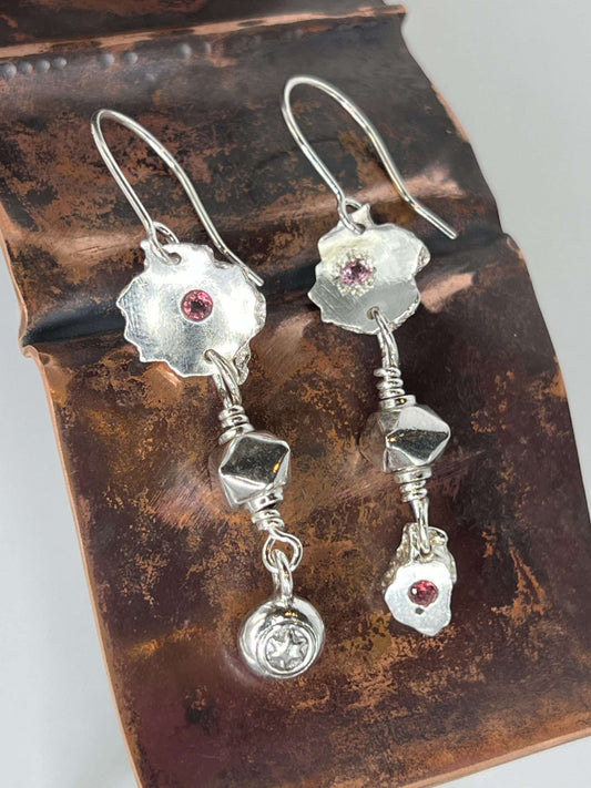 Long Dangle Earrings with Turquoise Drops and Garnet Ruedas