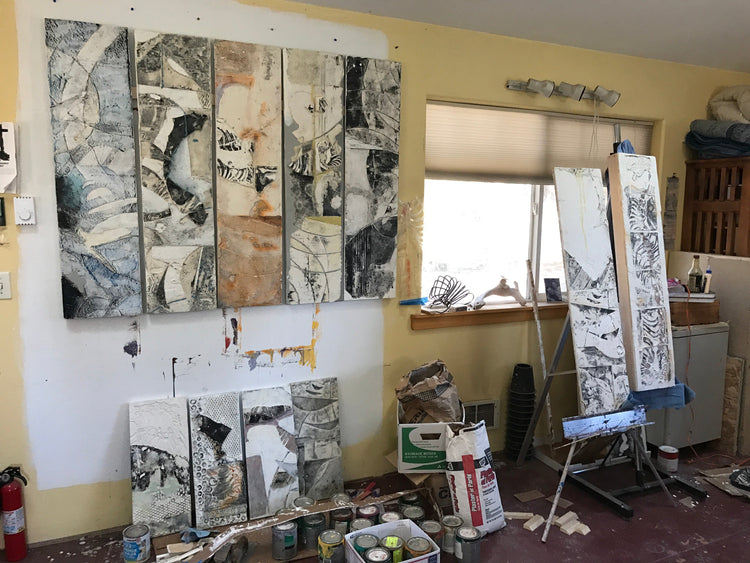 This series explores the use of large collagraph plates impressed into wet plaster. Once the plaster dries and cures, the bas relief is painted with encaustic to seal and embellish the plaster surface using minimal color. Backed with wood and uses a cleat system for hanging.