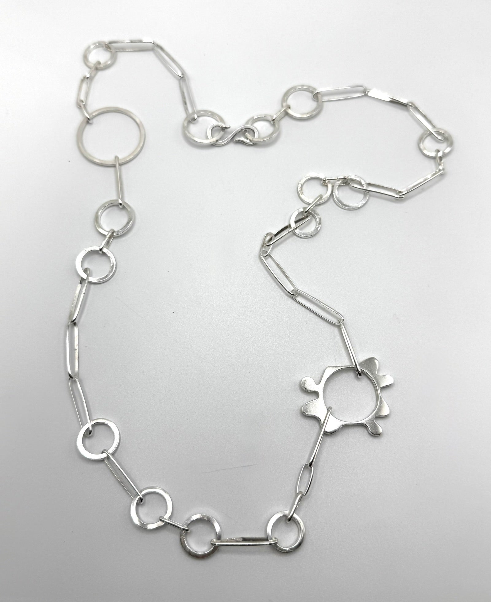 Discover countless styling possibilities with the Nebula Chain. Each link is handcrafted sterling silver, making this chain one-of-a-kind and beautifully flawless in its imperfection. Featuring a subtle S clasp, it offers versatile ways to wear, inspiring your creativity and personal expression. Length 29 inches