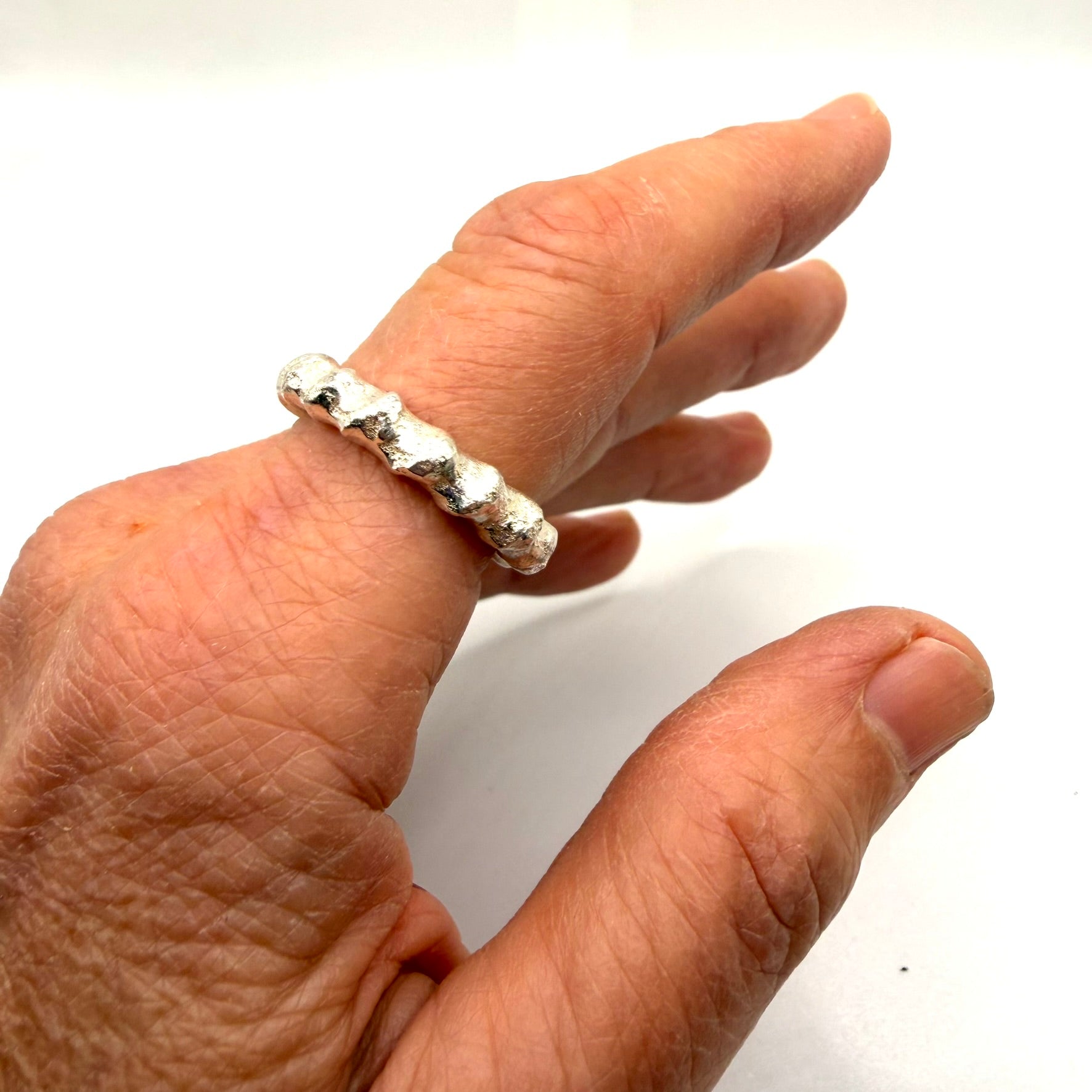 Carved from wax and then cast in sterling silver, this endlessly twisting ring makes a bold and textural statement. Luxuriously weighted and substantial, it feels great on the hand! Size 7. And here's a "twist" (pun intended!): this could make a fabulous pendant alternative!